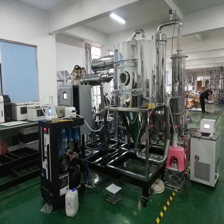 2、采用並流型噴(pēn)霧幹燥,幹燥過程中,液(yè)滴(dī)的溫(wēn)度不高,在噴霧(wù)幹燥室內,液滴與熱風同方(fāng)向流(liú)動,雖然熱(rè)風的溫度較高,但由於熱風進入幹燥室內立即(jí)與噴霧液滴接觸,室內(nèi)溫度急降,不致使幹燥物料受熱過度(dù)排出產品的溫度取決排風溫度,且低於排(pái)風溫度。