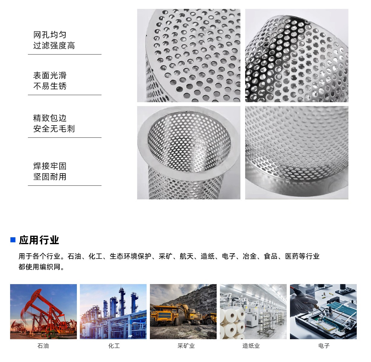 不鏽鋼異型過濾芯 具有廣泛的(de)應用,其中有汽車行業各類過濾片,過濾芯、過濾桶、咖啡機過濾、茶水機過濾(lǜ)、醫療行業各類過濾提籃、話筒過濾(lǜ)網、音響過濾網、圓筒過濾網、碟片式過濾片等等。