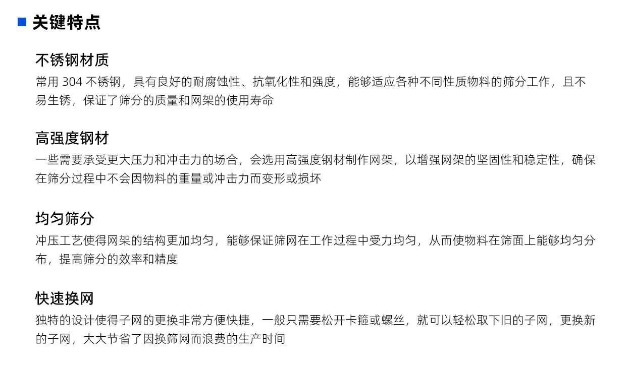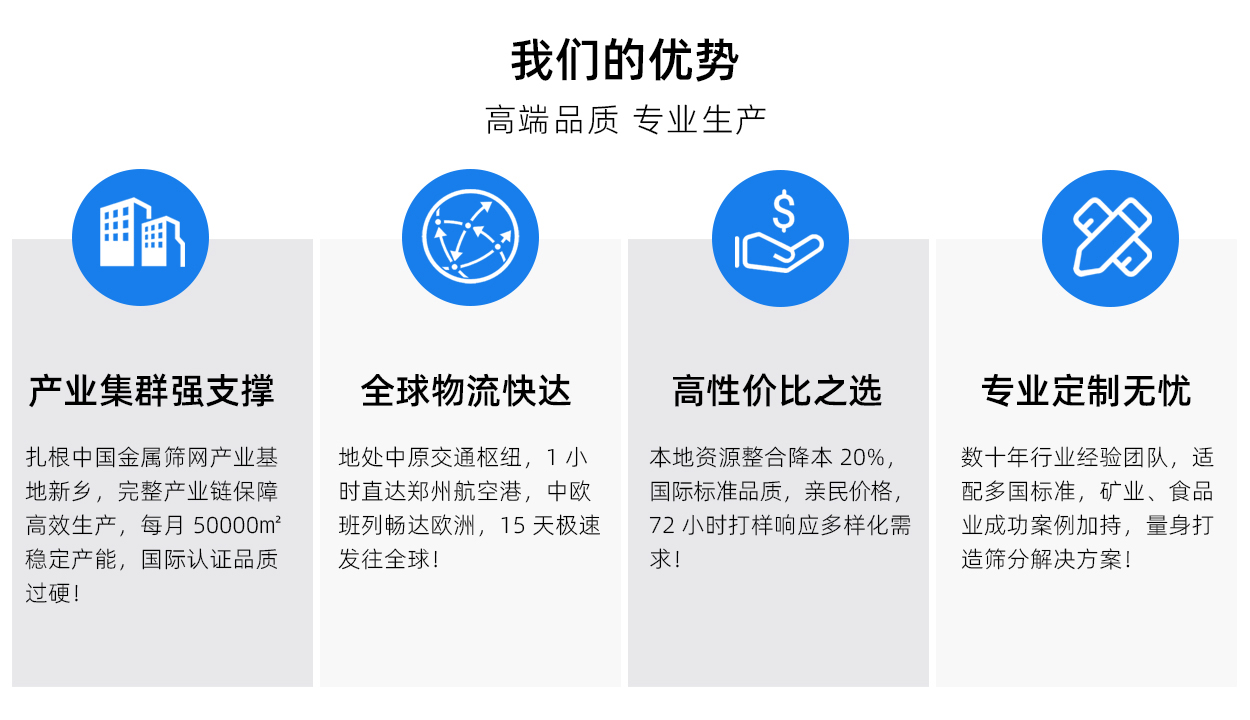 公司成立於 2016 年,擁有織網車間、濾器車間、集裝袋車間、篩網深加工等 4 個車間,是專注於篩分和過濾產品的研發、生產、銷售和(hé)技術(shù)服務的源頭(tóu)廠家。