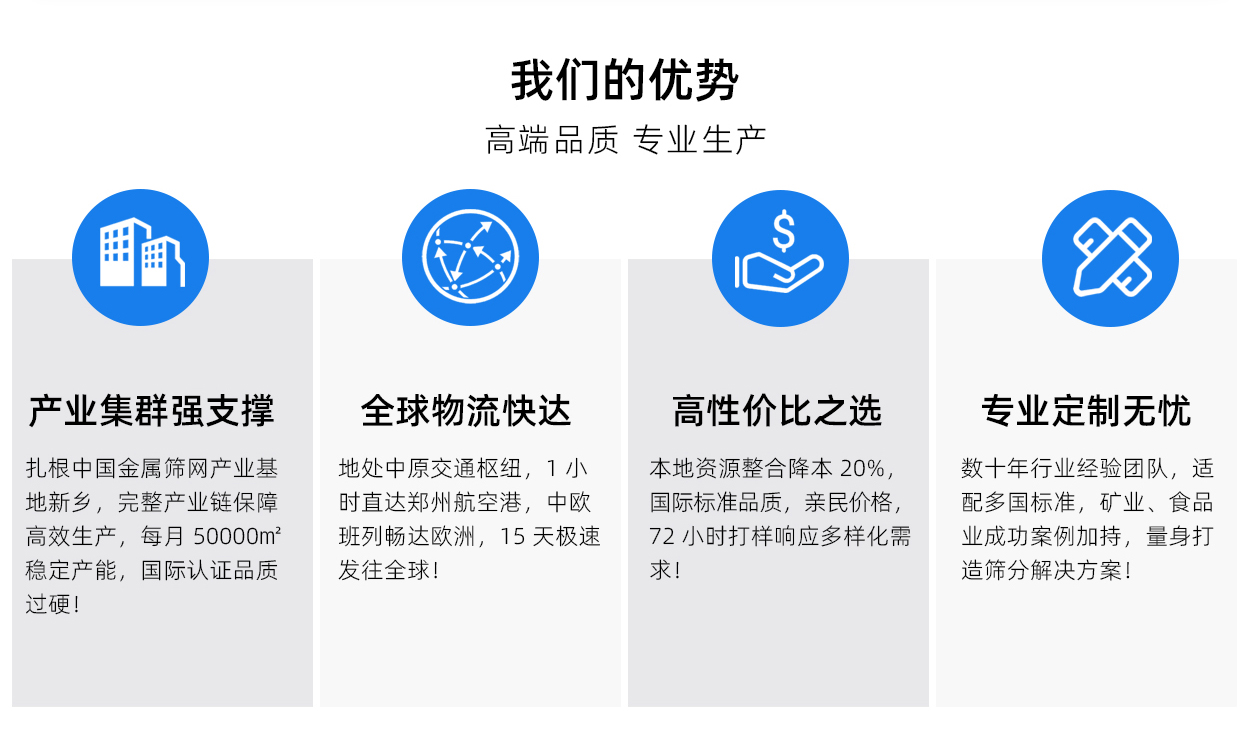 公司成立於 2016 年,擁有織網車間、濾器車間、集裝袋車間、篩網深加工等 4 個(gè)車間,是專注於篩分和過濾產品的研發、生產、銷售和技術服務的源(yuán)頭廠家。