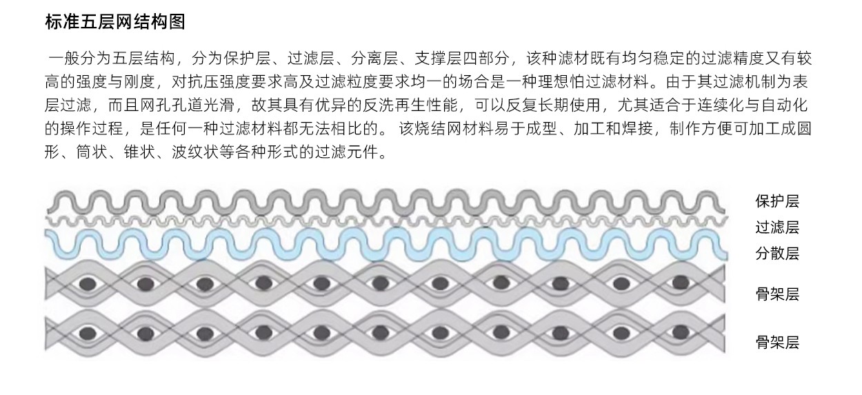 多(duō)層燒結金屬網(wǎng)是采用多層金屬編織絲網,通過特殊的疊層壓(yā)製與真空燒結等工藝製造而(ér)成,具有較高機械強(qiáng)度和整體剛性結構的一種新型過濾材料。其各層絲網的網孔相互交錯、形成一種均一而理想的過濾結構,不僅克服了普(pǔ)通金屬絲(sī)網(wǎng)強度低、剛性差、網孔(kǒng)形狀不穩定的不足,而且能夠對材料的孔隙大(dà)小、滲透性能和強度(dù)特性進行(háng)合理的匹配與設計,從而使其具有優良的過濾精(jīng)度(dù)、過濾(lǜ)阻抗(kàng)、機械強度、耐磨(mó)性、耐熱性和被(bèi)加工性,綜合性能明顯優於燒結金屬(shǔ)粉末、陶瓷、纖維、濾布、濾紙等其(qí)它類(lèi)型的過濾材料。