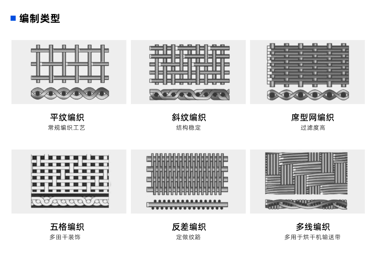 編織方式:方孔(kǒng)(平紋(wén)和斜紋)密紋(平紋密紋,斜紋密紋,反向平紋密紋網,反向斜紋密紋網)