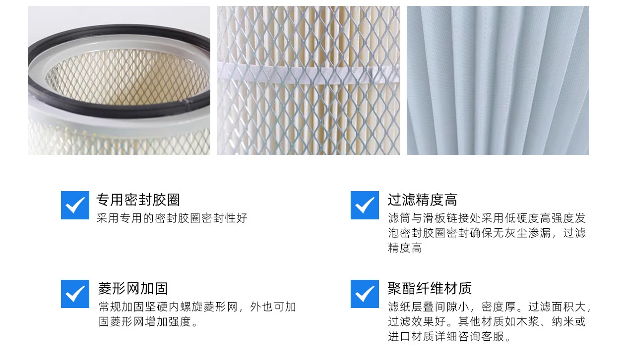 4.濾筒與滑板連接處采(cǎi)用低硬度高強度發泡密封膠圈密封確保無(wú)灰塵滲漏,過濾精度可達到99.9%;